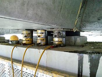 四川橋梁頂升加高須根據(jù)橋梁實(shí)際情況,對(duì)簡(jiǎn)支結(jié)構(gòu)體系橋梁,可單跨進(jìn)行頂升,也可一聯(lián)同時(shí)進(jìn)行頂升;對(duì)連續(xù)結(jié)構(gòu)體系橋梁,應(yīng)按一聯(lián)同時(shí)頂升,并保證頂升同步。施工時(shí)應(yīng)根據(jù)頂升計(jì)算的支撐反力,選擇千斤頂?shù)捻斏龂嵨唬WC千斤頂頂升噸位需大于2倍的頂升重量。