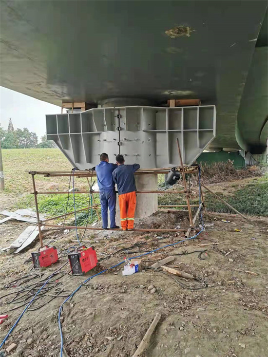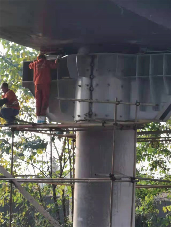 ①墩柱頂部范圍以下用鋼板包裹加固,在外包鋼板與原墩柱之間注入灌漿料;